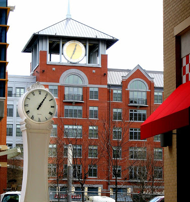 (With apologies to Morris Day.) This photo, taken by Rockville Central friend Eric Jensen (and cropped by me — don’t get mad, Eric), is a puzzler: “Why are all the outdoor clocks in downtown Rockville wrong?” Eric writes. “Maybe someone needs to change the batteries or plug them in or something. It’s never made any sense to me. (I don’t have a shot of the clock in front of the Regal, but it’s almost always wrong, too). In this shot, it really is 12:35 p.m., so the yellow clock is correct, but the white clock has been 1:05 since it was installed.”