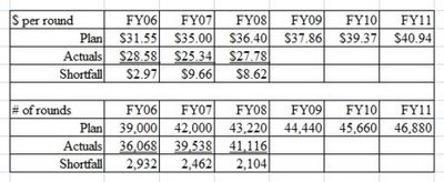 The Plan identified two key ingredients to success – average dollars spent per round, and total rounds played. Below are the Plan’s projections for both measures and results to date. Results have fallen far short of the Plan, and the results for FY09 will not be any better, given the sharp drop in rounds played last summer.