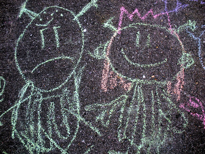 This was drawn on a friend’s driveway. It’s a detail of a larger tableau. I think the bit I am looking at is a queen (on the right) and a king. But I am not so sure about the king. He might instead be an alien.