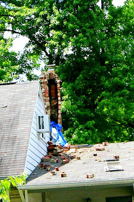 “The chimney of this house across the street from our former home in Hungerford was struck by lightning on Friday evening. The rain guard was blown right off, along with half the chimney. There are even bricks strewn on the grass below. I don’t know what other damage was sustained — I believe the owners are away and I send them my deep sympathy. (We once returned home from a vacation to find the upper floor of our house completely burned — not a good welcome home). Coincidentally, over the weekend someone posted a link on Twitter to an article about the increase in lightning strikes this year. I wonder if there is anything we can do to prevent this kind of disaster in our homes. At least we should be aware of the increased danger to ourselves and not be outside during a thunderstorm.”