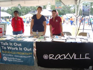 The white tents spread across the entire parking lot to accommodate over 10,000 visitors to the Fair, up from 8,000 last year. Booths had information on recreation programs and resources available in the County. Kaiser Permanente provided health information. Nutrition was an important theme. A human-sized bunch of grapes and a banana traversed around the crowd. Kids jumped in the moonbounce, ate Carmen’s Italian Ice, and talked to a robot. Throughout the day, the main stage was jumping. The organizers understood that kids like to move. The Washington Talent Agency kept the crowd upbeat and dancing.