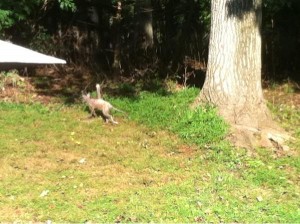 In addition, we are fairly certain it’s been stalking our kitties for a few weeks. We could smell the urine around, saw some scat on our driveway, and the male kitty was acting very nervous. He could smell the coyote when he came out where it’d been around our bushes. Our cats only go outside with our unadulterated supervision. But we are keeping them in now, much to their chagrin.