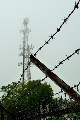 I pretty much don’t like rain. However, a rainy day can sometimes create nifty images, like this radio tower rising in the distance over the gas transmission field on MD-355 near Montgomery College. The barbed wire around the property always fascinates me.