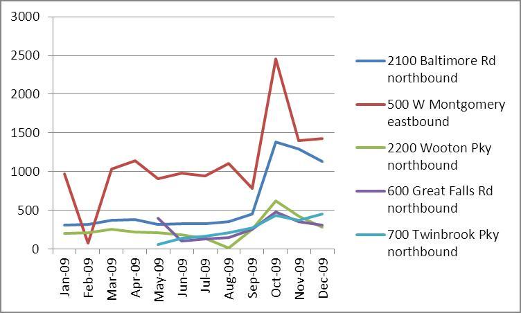 The “spike” in Fall 2009 was repeated almost uniformly in the five locations that I plotted. What do you suppose that this could “mean”? Is there a coincidence that it occurred shortly before the City election? Or perhaps the cameras were all recalibrated around that time? Or could the citizens of Rockville have suddenly been spontaneously seized with the urge to drive recklessly?