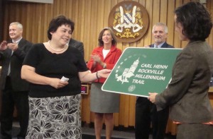 Wanting to properly honor all of Carl’s volunteer work, the City officially renamed our 10-mile bicycle beltway, the Carl Henn Rockville Millennium Trail. One of the new signs was presented to his family. A plaque recognizing his work will be posted on the Trail. Future signage and maps will reflect the new name of the Trail.