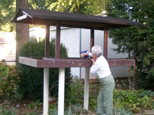 At each home, the participants observed food, water, cover, places to raise young as well as sustainable gardening practices. All yards contained beautiful native plants. The Lew yard had lots of compost, wood features that provided shelter and places to raise young for insects, and unusual and attractive rain barrels. The Pierczhala/Cross yard was beautifully designed for enjoyment and to slow heavy water running through the property. One item in the chain of water runoff retention was a rain garden. The Andrews home was a townhouse. The plantings were nicely structured, and there were some unusual and lovely water features for birds. The Hanessian home was relatively wooded, had a very interesting low technology bird bath (a pail of water with a large rock on which the birds could sit), and a brush pile owned by a catbird. Our Goodman/Farrelly yard featured sunflowers, a fish pond, a home-made rat-proof bird feeder, and a solar fountain.