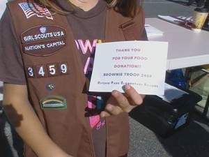 Manna Food Center regularly has volunteers collect food at the Farmers Market. Donations to the Manna Food Center insure everyone in Montgomery County has food to eat. Ritchie Park Elementary School’s Brownie Troop 3459 volunteered to collect on Saturday. How could you turn them down? They collected a grand total of 686 pounds of food!