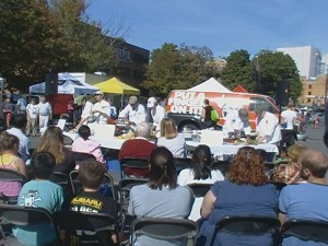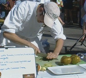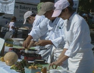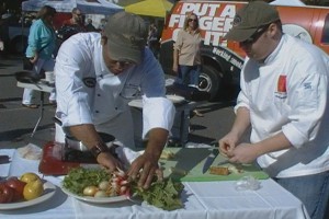 To demonstrate how impressive our Saturday Farmers Market has become, the City invited chefs from Clyde’s to give a cooking demonstration last Saturday, September 11, 2010. Clyde’s buys their local ingredients from the Farmers Market twice each week on Wednesday and Saturday. Getting into the spirit of the invitation, head chef Jeff Eng suggested a cook off between his chefs. The result was a fast-paced and creative competition which had the audience watching three teams quickly prepare three-course feasts using the ingredients they had just purchased.