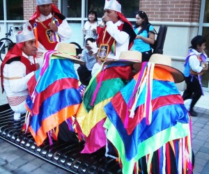 Over 50 Bolivian dancers showed up at Rockville’s Hispanic Heritage Celebration on Saturday, September 20, 2010. Throughout the afternoon, groups in different costumes filled the square with many of the men’s outfits matching the women’s dresses, plus a bunch of little kids joined in the fun with their own colorful versions. Four hours of movement was presented by Caporales Universitarios San Simon, Café Caribe, Caminito Amigo, Fraternidad, Diablada Boliviana, Arte Flamenco, and Ballet Ritmos del Peru. After the show was over, the dancers stayed around and had something to eat together. The audience did the same.