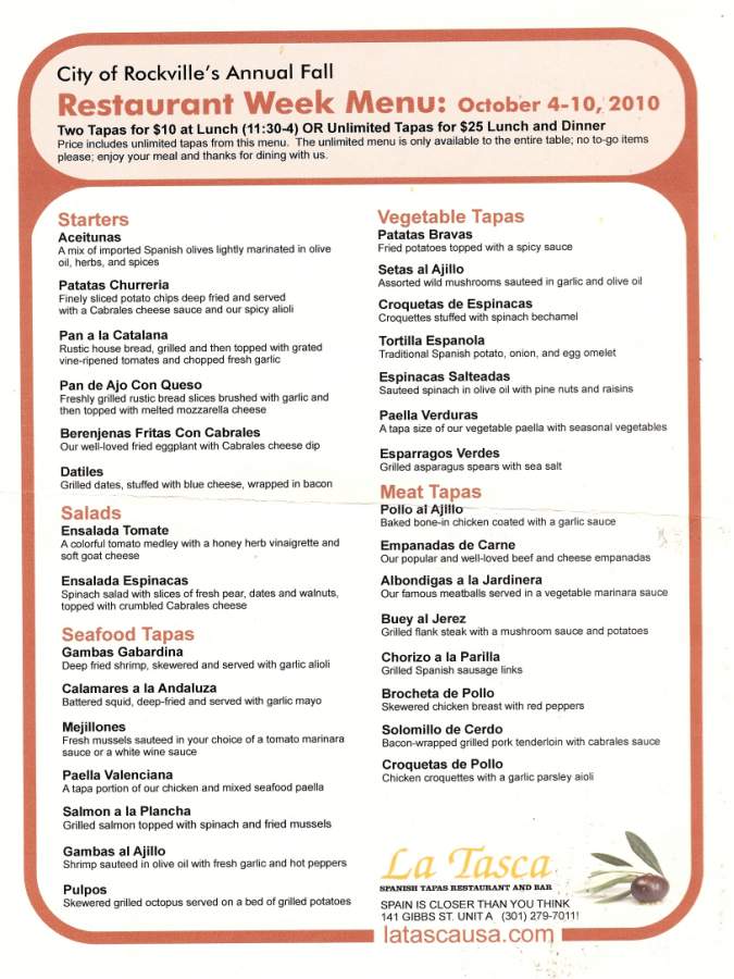 La Tasca is one of the participating restaurants in Rockville Restaurant Week, which is going on this week until Sunday, October 10th. Participating restaurants all have fixed-price deals for both lunch (if they serve it) and dinner. All the details are here. And here’s a list of all participating restaurants.