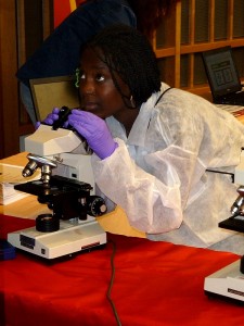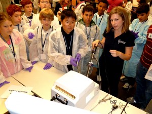 Today, Johns Hopkins University, Shady Grove Adventist Hospital, and other companies and organizations in the Shady Grove Life Sciences Center held the second annual Frontiers in Science and Medicine Day. All seventh graders from Rockville’s Julius West Middle School and Montgomery Village Middle School traveled to the Shady Grove Life Sciences Center for lab tours in a variety of company labs and hands-on science experiments at the JHU Montgomery County Campus.