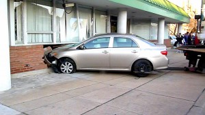 This afternoon shortly before 4:00 pm, a Toyota sedan turning left from Monroe northbound onto East Jefferson apparently lost control, hopped the curb, and struck the PNC Bank building on the corner.